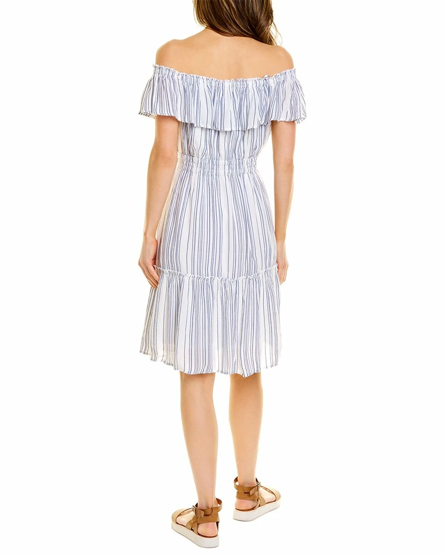 - Aloha Avenue Dress in mazarine blue with off-the-shoulder design, tiered shirring, draped neckline, and elasticized waist