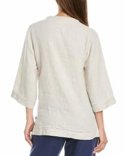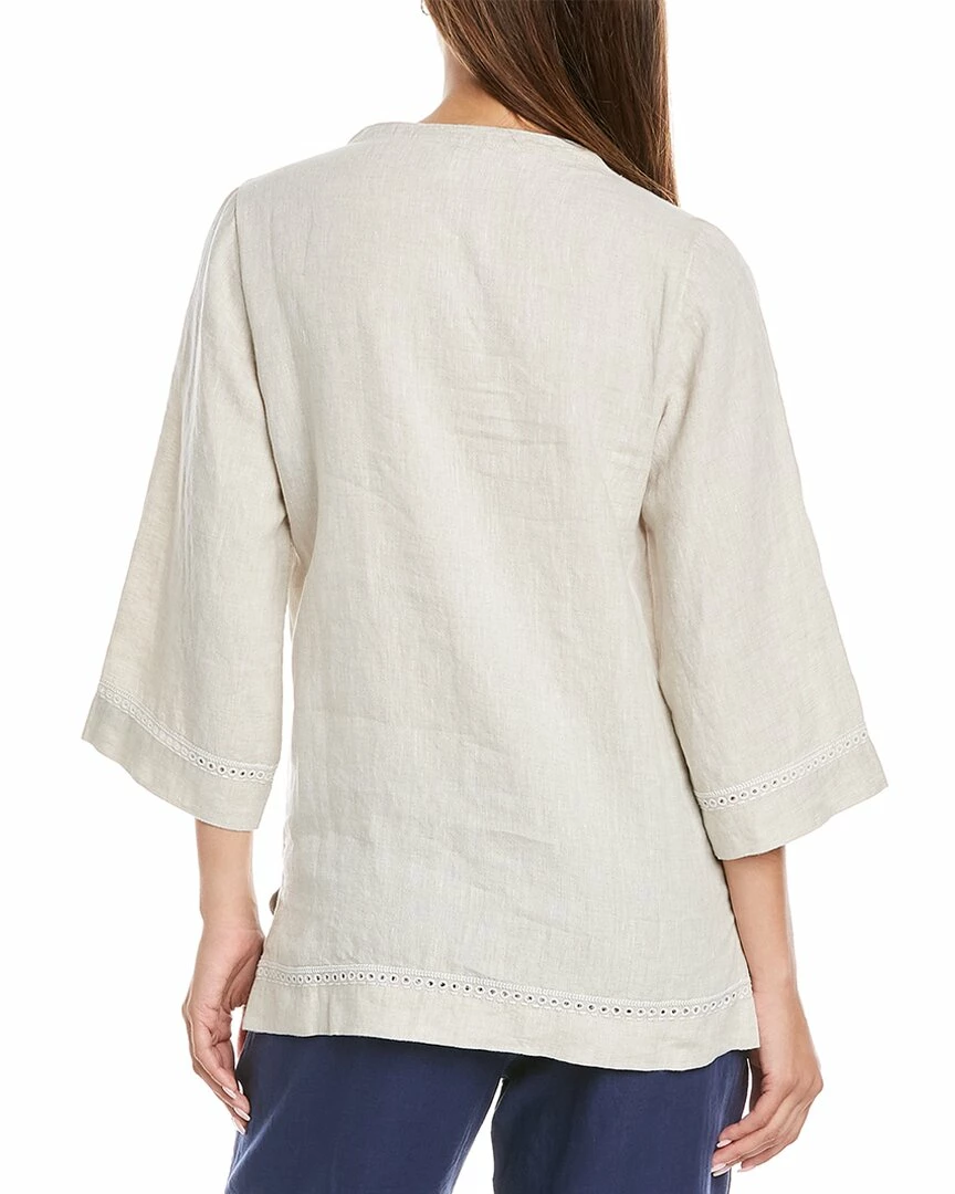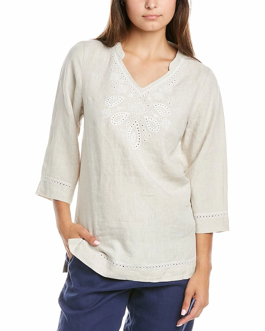- Au Natural Linen Tunic in natural with 3/4-length sleeves and embroidered detailing
