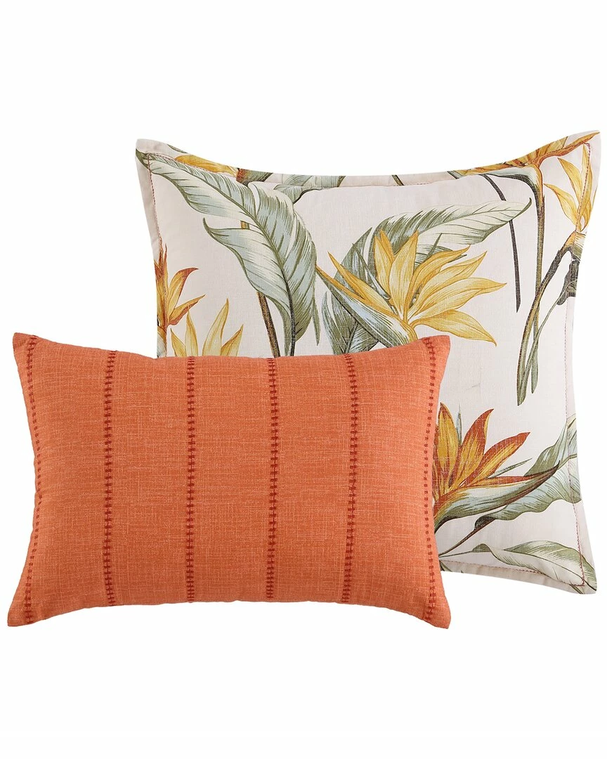 - Design details: this comforter has a cozy medium weight, slightly textured feel, comforter fill- 100% polyester: 8 oz. fill weight per square inch, included shams feature a 2in self flange and a 2 piece back closure, made in oeko-tex standard 100 factory, an independent certification system that ensures textiles meet high safety and environmental standards, this comforter bonus set features a tropical palm design in muted coconut and green tones with orange and yellow accents with a textured print reverse, the square breakfast pillow matches the comforter face print, while the oblong breakfast pillow adds a pop of color in a bright orange shade with vertical stitching detail