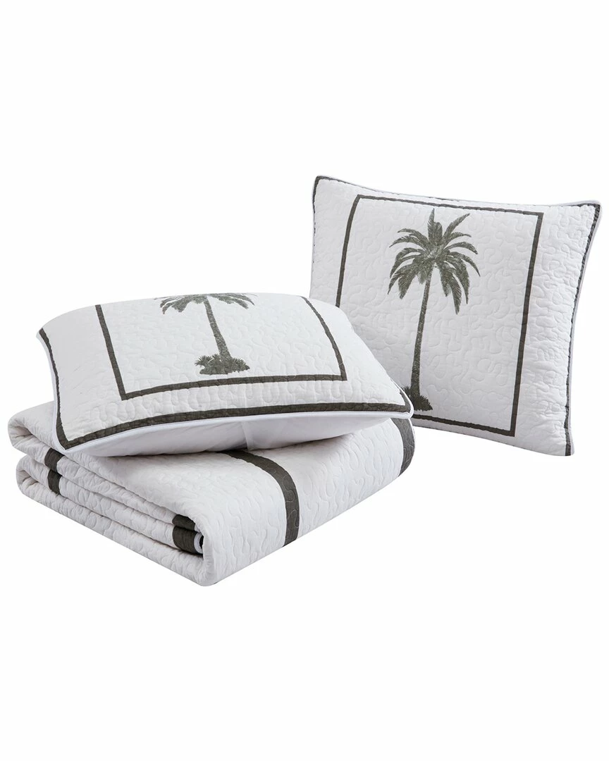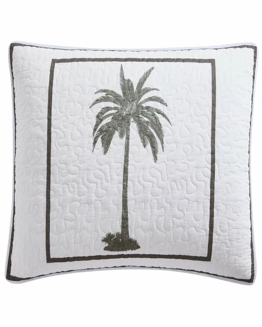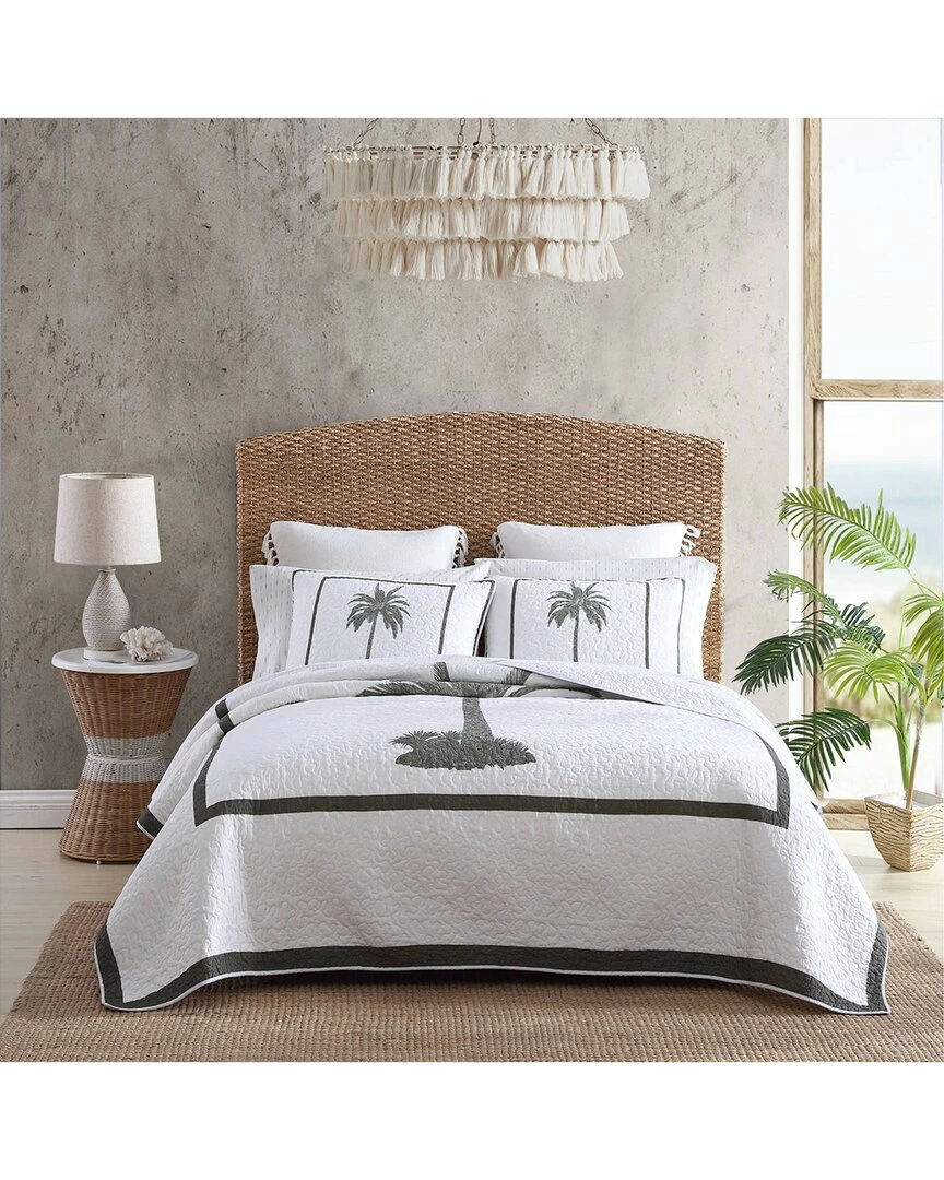 - Design details: the tommy bahama palm island quilt was inspired by the tropical island in hawaii. the tommy bahama palm island quilt features engineered embroidered palm motif in a beautiful green color on a quilted white ground. the reverse is white. this quilt is 100% cotton, with a cotton (80%)/polyester (20%) filling, lightweight and easy to layer. the shams feature a two piece back closure. the corners of the quilt are rounded to match the sham, both edges are finished with a fabric binding. this quilt is fully reversible. we have reduced the packaging, eliminating all plastic. your quilt set will arrive secured with a ribbon. quilt and shams are sold separately. machine washable, for easy care.
