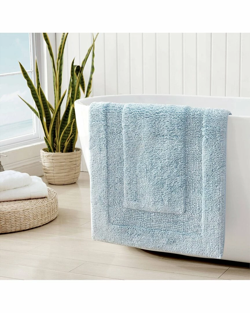 - Design details: this bath rug is durable and soft, 260gsm,highly absorbent and low linting,oeko-tex certified, the mark of excellence for products that are healthy for you and healthy for the environment., this bath rug is tufted and reversible, features a bright solid yarn dyed light pastel blue ground and a framed border pattern