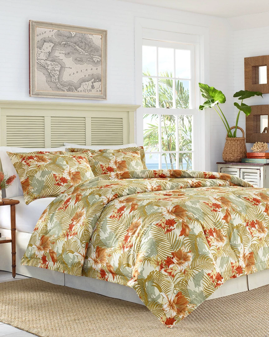 - Design details: Set the scene for sweet dreams of island living with exotic, spice tone blooms amid a lush garden of swaying palm fronds and tropical leaves in olive and sage on a warm ivory ground. This luxurious island botanical is printed on a slub-textured all cotton fabric that enhances the casual mood of the design. Tailored European shams in a neutral sand herringbone weave add additional textural interest and relaxed style. Decorative accent pillows add the brands signature touch with detailed botanical embroidery and applique accents. Add a Tommy Bahama printed sheet set such as batik squares and the solid ivory nassau quilt for a sophisticated, layered finish to the ensemble.