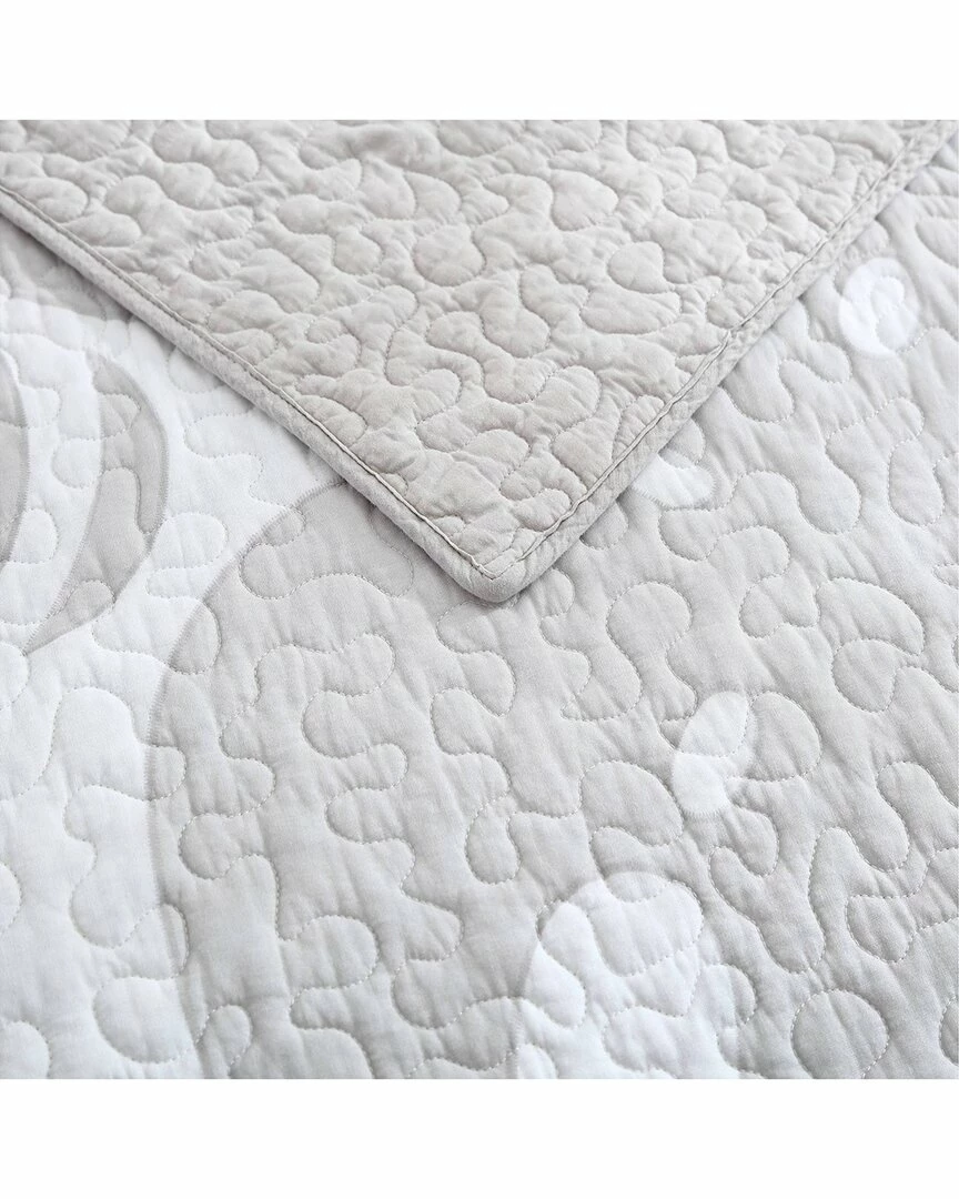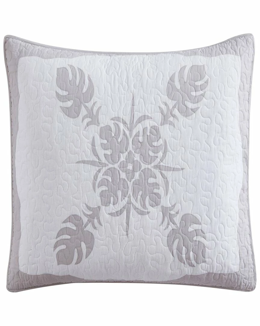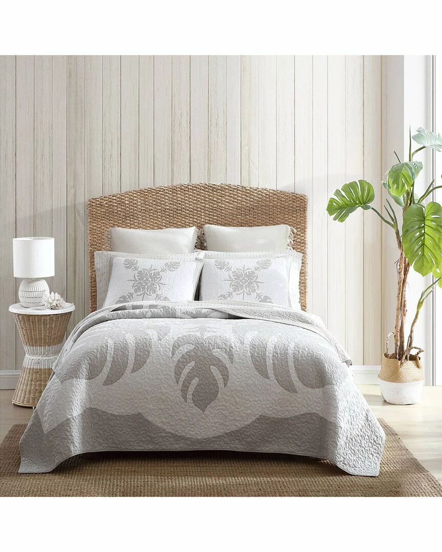 - Design details: the tommy bahama molokai quilt was inspired by the tropical island in hawaii. the tommy bahama molokai quilt features embroidered tropical motifs in a beautiful green color on a quilted white ground. the reverse is grey. this quilt is 100% cotton, with a cotton (80%)/polyester (20%) filling, lightweight and easy to layer. the shams feature a two piece back closure. the corners of the quilt are rounded to match the sham, both edges are finished with a fabric binding. this quilt is fully reversible. we have reduced the packaging, eliminating all plastic. your quilt set will arrive secured with a ribbon. quilt and shams are sold separately. machine washable, for easy care.
