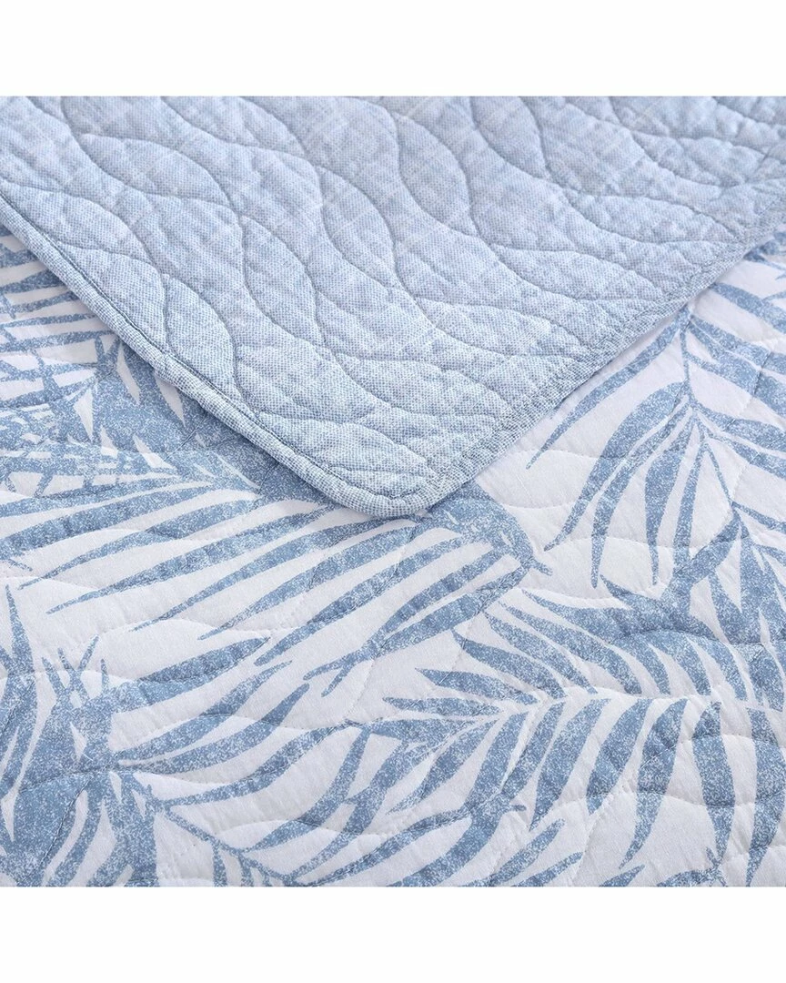 - Design details: this quilt set is lightweight, with a casual style; prewashed for added softness, quilt fill: 80% cotton & 20% polyester; blended to create a durable quilt, rounded corner shams with two piece back closures for easy removal; quilts are reversible offering a combination of traditional and soft texture options, made in oeko-tex standard 100 factory, an independent certification system that ensures textiles meet high safety and environmental standards, the tommy bahama palmday quilt set features an allover printed medium blue fern design on a white ground. the reverse is a textured light blue